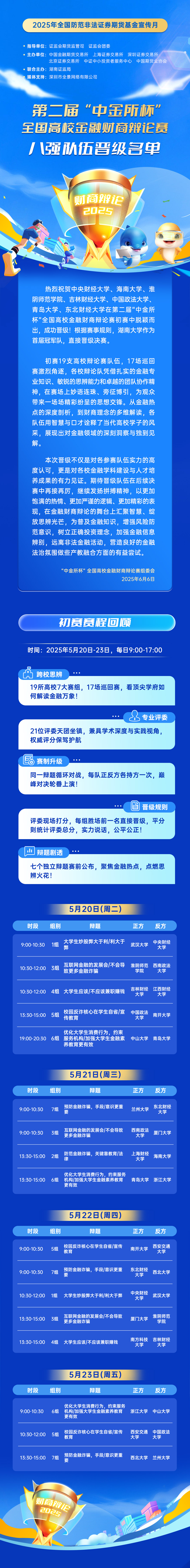 赛事邀请金融基础设施、行业协会专家、财经媒体专家组成评审团,从社会实践、学术研究、辩论技巧、团队协作等维度对辩手表现进行专业点评,为选手提供观察金融行业的全景式视角。晋级总决赛的队伍将围绕金融市场投资者?;?、数字经济与金融创新等前沿议题展开对决,精彩赛事,敬请期待!