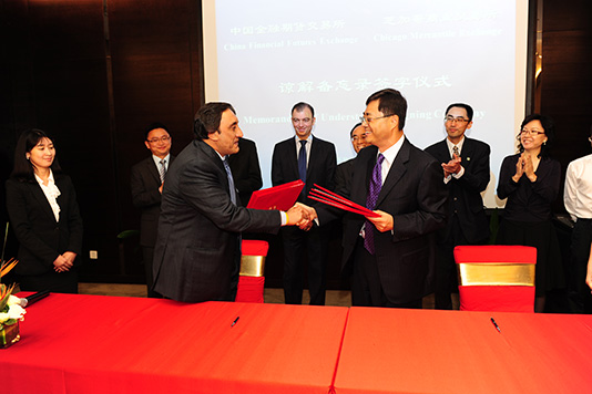 为推动与境外交易所的深层次交流与合作,我所与芝加哥商业交易所(CME)、芝加哥期权交易所(CBOE)、德国交易所(DBAG)、纽约泛欧交易所集团(NYSE EURONEXT)等四家境外交易所于2012年5月16日至17日分别签订合作谅解备忘录。备忘录签订仪式于北京举行,我所总经理朱玉辰、CME CEO Phupinder Gill先生、CBOE执行副总裁Richard DuFour、DBAG副总裁兼欧洲期货交易所(EUREX) CEO Andreas Preuss先生、纽约泛欧交易所集团副总裁及全球衍生品CEO Garry Jones先生分别代表各自交易所签署了备忘录。