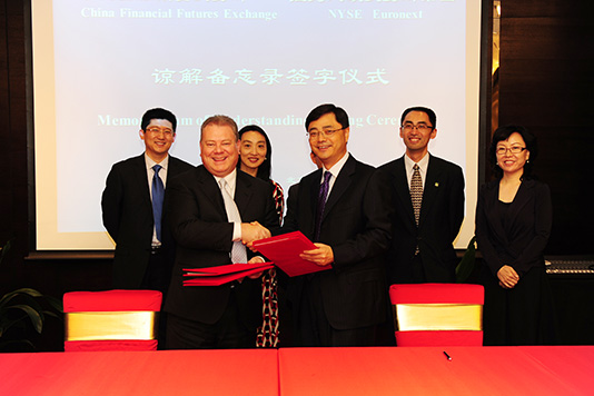 为推动与境外交易所的深层次交流与合作,我所与芝加哥商业交易所(CME)、芝加哥期权交易所(CBOE)、德国交易所(DBAG)、纽约泛欧交易所集团(NYSE EURONEXT)等四家境外交易所于2012年5月16日至17日分别签订合作谅解备忘录。备忘录签订仪式于北京举行,我所总经理朱玉辰、CME CEO Phupinder Gill先生、CBOE执行副总裁Richard DuFour、DBAG副总裁兼欧洲期货交易所(EUREX) CEO Andreas Preuss先生、纽约泛欧交易所集团副总裁及全球衍生品CEO Garry Jones先生分别代表各自交易所签署了备忘录。